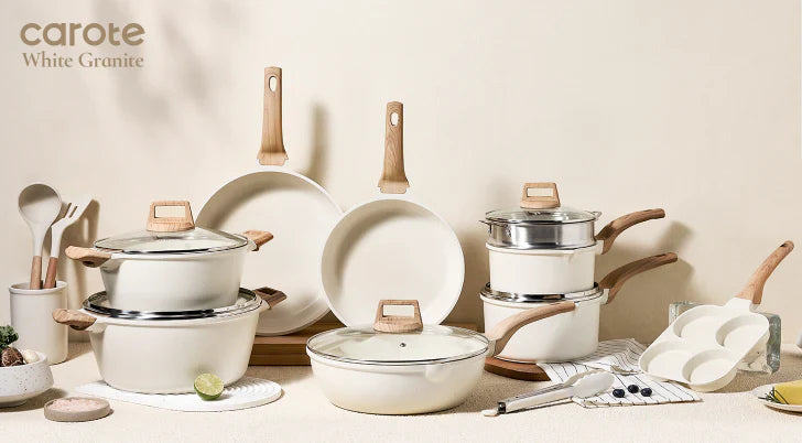 Upgrade je keuken met de 21-delige CAROTE Set – gemaakt van gietaluminium met een premium graniet-look antiaanbaklaag. Hij zorgt voor gelijkmatige warmteverdeling, moeiteloos loslaten van voedsel en volledige compatibiliteit met alle kookplaten (inclusief inductie) voor serieus dagelijks koken.